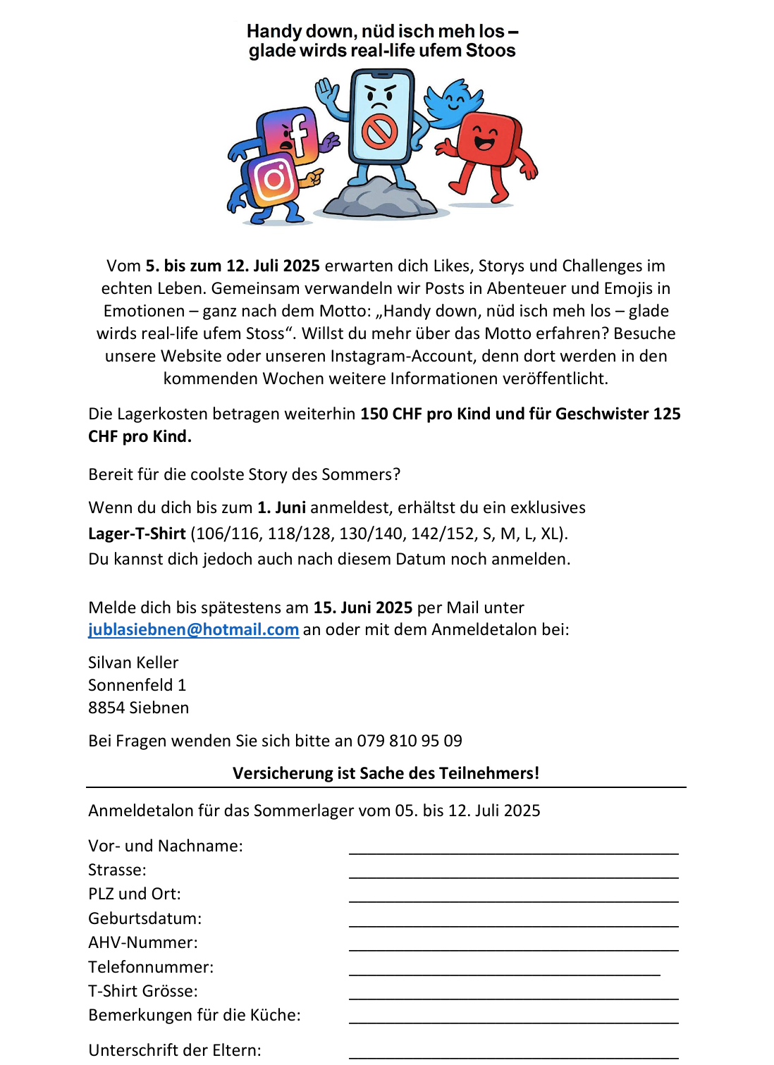 Bei Fragen kannst du dich an Adriana wenden 076/520 49 14 oder jubla.siebnen@db.jubla.ch